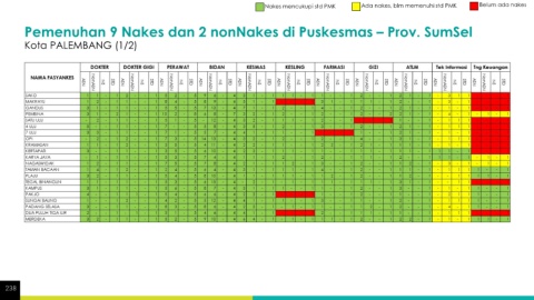 Nakes mencukupi std PMK Ada nakes, blm memenuhi std PMK Belum ada nakes Pemenuhan 9 Nakes dan 2 nonNakes di Puskesmas – Prov. SumSel Kota PALEMBANG (1/2) 238