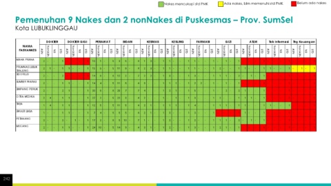 Nakes mencukupi std PMK Ada nakes, blm memenuhi std PMK Belum ada nakes Pemenuhan 9 Nakes dan 2 nonNakes di Puskesmas – Prov. SumSel Kota LUBUKLINGGAU 242