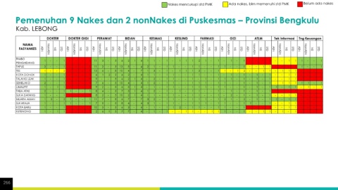 Nakes mencukupi std PMK Ada nakes, blm memenuhi std PMK Belum ada nakes Pemenuhan 9 Nakes dan 2 nonNakes di Puskesmas – Provinsi Bengkulu Kab. LEBONG 266