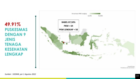 BABEL 0,00% 5,21% PKM TANPA DOKTER = 0 49.91% BABEL 87,50% PKM = 64 PKM = 64 PKM PUSKESMAS PKM LENGKAP = 56 DENGAN 9 TANPA JENIS DOKTER TENAGA KESEHATAN LENGKAP Sumber : SISDMK, per 1 Agustus 2022 Sumber : SISDMK, per 1 Agustus 2022 309