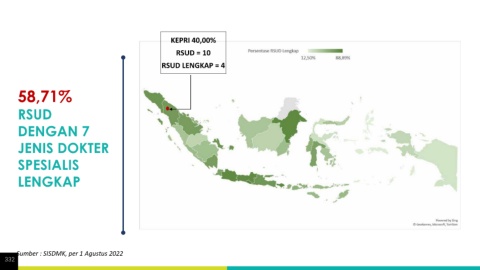 KEPRI 40,00% RSUD = 10 RSUD LENGKAP = 4 58,71% RSUD DENGAN 7 JENIS DOKTER SPESIALIS LENGKAP Sumber : SISDMK, per 1 Agustus 2022 332
