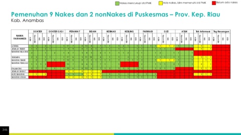 Nakes mencukupi std PMK Ada nakes, blm memenuhi std PMK Belum ada nakes Pemenuhan 9 Nakes dan 2 nonNakes di Puskesmas – Prov. Kep. Riau Kab. Anambas 346