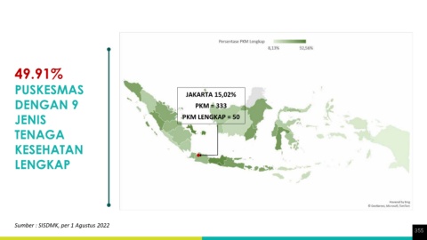 5,21% 49.91% PKM JAKARTA 0,00% PUSKESMAS JAKARTA 15,02% PKM = 333 DENGAN 9 PKM = 333 TANPA PKM TANPA DOKTER = 0 JENIS PKM LENGKAP = 50 DOKTER TENAGA KESEHATAN LENGKAP Sumber : SISDMK, per 1 Agustus 2022 Sumber : SISDMK, per 1 Agustus 2022 355