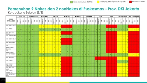 Nakes mencukupi std PMK Ada nakes, blm memenuhi std PMK Belum ada nakes Pemenuhan 9 Nakes dan 2 nonNakes di Puskesmas – Prov. DKI Jakarta Kota Jakarta Selatan (5/5) 372