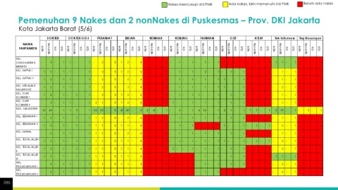Nakes mencukupi std PMK Ada nakes, blm memenuhi std PMK Belum ada nakes Pemenuhan 9 Nakes dan 2 nonNakes di Puskesmas – Prov. DKI Jakarta Kota Jakarta Barat (5/6) 386