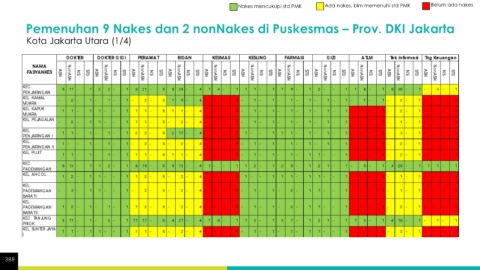 Nakes mencukupi std PMK Ada nakes, blm memenuhi std PMK Belum ada nakes Pemenuhan 9 Nakes dan 2 nonNakes di Puskesmas – Prov. DKI Jakarta Kota Jakarta Utara (1/4) 388