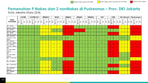 Nakes mencukupi std PMK Ada nakes, blm memenuhi std PMK Belum ada nakes Pemenuhan 9 Nakes dan 2 nonNakes di Puskesmas – Prov. DKI Jakarta Kota Jakarta Utara (3/4) 390