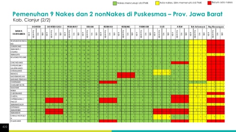 Nakes mencukupi std PMK Ada nakes, blm memenuhi std PMK Belum ada nakes Pemenuhan 9 Nakes dan 2 nonNakes di Puskesmas – Prov. Jawa Barat Kab. Cianjur (2/2) 420