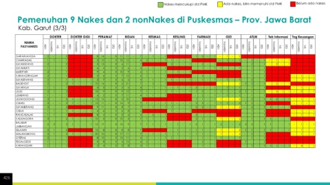 Nakes mencukupi std PMK Ada nakes, blm memenuhi std PMK Belum ada nakes Pemenuhan 9 Nakes dan 2 nonNakes di Puskesmas – Prov. Jawa Barat Kab. Garut (3/3) 426