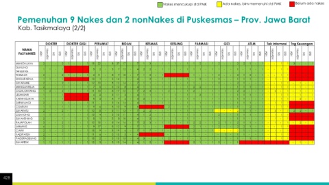 Nakes mencukupi std PMK Ada nakes, blm memenuhi std PMK Belum ada nakes Pemenuhan 9 Nakes dan 2 nonNakes di Puskesmas – Prov. Jawa Barat Kab. Tasikmalaya (2/2) 428