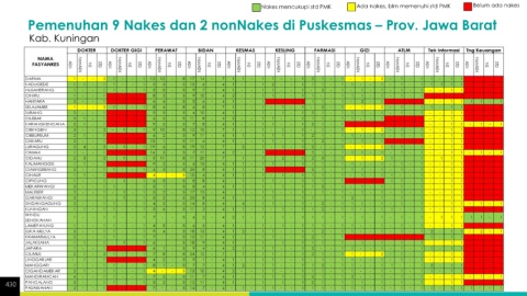 Nakes mencukupi std PMK Ada nakes, blm memenuhi std PMK Belum ada nakes Pemenuhan 9 Nakes dan 2 nonNakes di Puskesmas – Prov. Jawa Barat Kab. Kuningan 430
