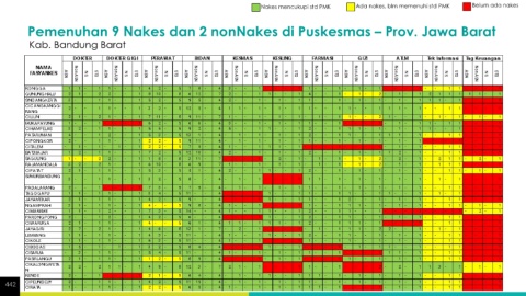 Nakes mencukupi std PMK Ada nakes, blm memenuhi std PMK Belum ada nakes Pemenuhan 9 Nakes dan 2 nonNakes di Puskesmas – Prov. Jawa Barat Kab. Bandung Barat 442