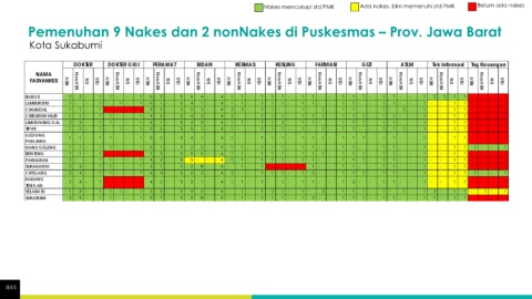 Nakes mencukupi std PMK Ada nakes, blm memenuhi std PMK Belum ada nakes Pemenuhan 9 Nakes dan 2 nonNakes di Puskesmas – Prov. Jawa Barat Kota Sukabumi 444