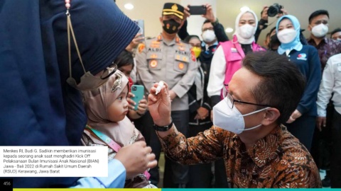 Menkes RI, Budi G. Sadikin memberikan imunisasi kepada seorang anak saat menghadiri Kick Off Pelaksanaan Bulan Imunisasi Anak Nasional (BIAN) Jawa - Bali 2022 di Rumah Sakit Umum Daerah (RSUD) Kerawang, Jawa Barat 456