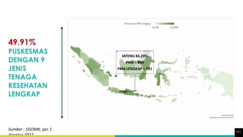 5,21% 49.91% PKM JATENG 0,00% PUSKESMAS JATENG 84,20% DENGAN 9 PKM = 880 PKM = 880 TANPA PKM TANPA DOKTER = 0 JENIS PKM LENGKAP = 741 DOKTER TENAGA KESEHATAN LENGKAP Sumber : SISDMK, per 1 Sumber : SISDMK, per 1 Agustus 2022 Agustus 2022 463
