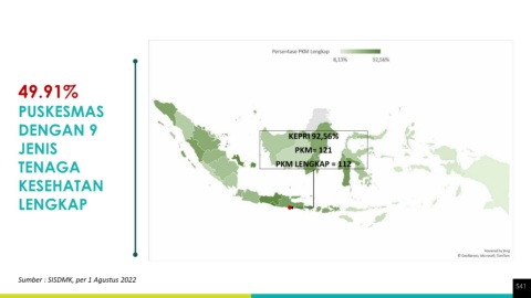 5,21% 49.91% PKM DIY 0,00% PUSKESMAS DENGAN 9 PKM= 121 TANPA PKM TANPA DOKTER = 0 JENIS KEPRI 92,56% PKM= 121 DOKTER TENAGA PKM LENGKAP = 112 KESEHATAN LENGKAP Sumber : SISDMK, per 1 Agustus 2022 Sumber : SISDMK, per 1 Agustus 2022 541