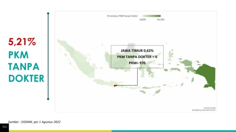 5,21% PKM PKM TANPA DOKTER = 6 JAWA TIMUR 0,62% TANPA PKM= 970 DOKTER Sumber : SISDMK, per 1 Agustus 2022 562