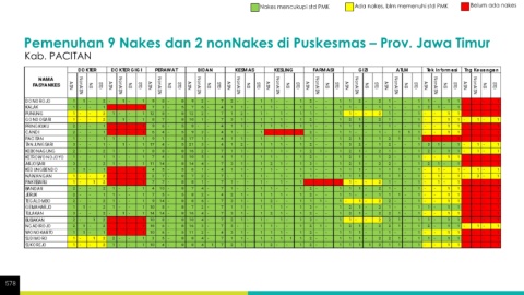 Nakes mencukupi std PMK Ada nakes, blm memenuhi std PMK Belum ada nakes Pemenuhan 9 Nakes dan 2 nonNakes di Puskesmas – Prov. Jawa Timur Kab. PACITAN 578