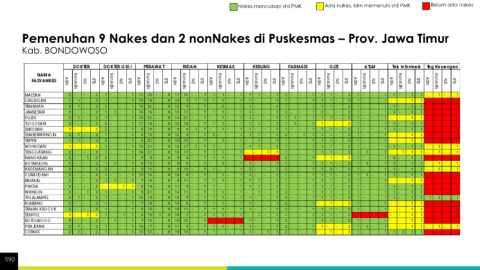 Nakes mencukupi std PMK Ada nakes, blm memenuhi std PMK Belum ada nakes Pemenuhan 9 Nakes dan 2 nonNakes di Puskesmas – Prov. Jawa Timur Kab. BONDOWOSO 590
