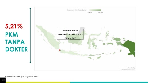 5,21% BANTEN 0,40% PKM PKM TANPA DOKTER = 1 TANPA PKM = 247 DOKTER Sumber : SISDMK, per 1 Agustus 2022 622