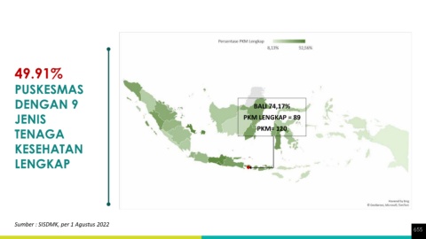 5,21% 49.91% PKM PKM TANPA DOKTER = 0 PUSKESMAS BALI 74,17% BALI 0% DENGAN 9 TANPA PKM= 120 JENIS PKM LENGKAP = 89 PKM= 120 DOKTER TENAGA KESEHATAN LENGKAP Sumber : SISDMK, per 1 Agustus 2022 Sumber : SISDMK, per 1 Agustus 2022 655