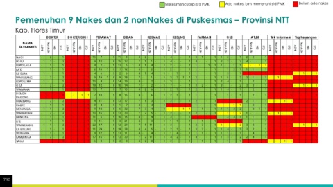 Nakes mencukupi std PMK Ada nakes, blm memenuhi std PMK Belum ada nakes Pemenuhan 9 Nakes dan 2 nonNakes di Puskesmas – Provinsi NTT Kab. Flores Timur 730