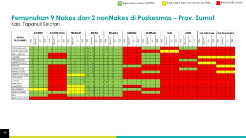 Nakes mencukupi std PMK Ada nakes, blm memenuhi std PMK Belum ada nakes Pemenuhan 9 Nakes dan 2 nonNakes di Puskesmas – Prov. Sumut Kab. Tapanuli Selatan 80