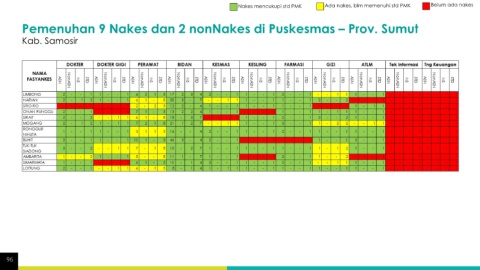 Nakes mencukupi std PMK Ada nakes, blm memenuhi std PMK Belum ada nakes Pemenuhan 9 Nakes dan 2 nonNakes di Puskesmas – Prov. Sumut Kab. Samosir 96