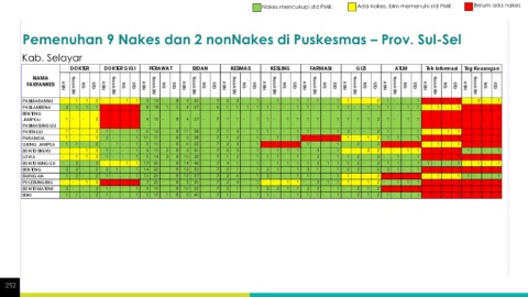 Nakes mencukupi std PMK Ada nakes, blm memenuhi std PMK Belum ada nakes Pemenuhan 9 Nakes dan 2 nonNakes di Puskesmas – Prov. Sul-Sel Kab. Selayar 252