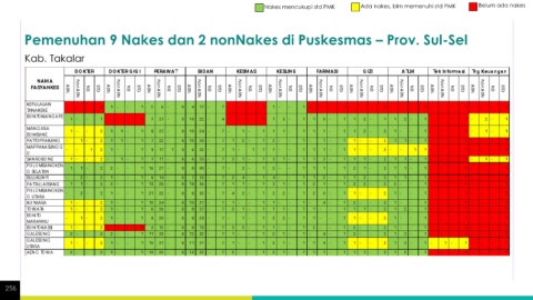 Nakes mencukupi std PMK Ada nakes, blm memenuhi std PMK Belum ada nakes Pemenuhan 9 Nakes dan 2 nonNakes di Puskesmas – Prov. Sul-Sel Kab. Takalar 256