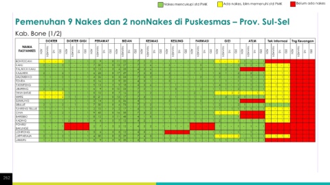 Nakes mencukupi std PMK Ada nakes, blm memenuhi std PMK Belum ada nakes Pemenuhan 9 Nakes dan 2 nonNakes di Puskesmas – Prov. Sul-Sel Kab. Bone (1/2) 262