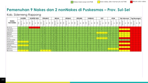 Nakes mencukupi std PMK Ada nakes, blm memenuhi std PMK Belum ada nakes Pemenuhan 9 Nakes dan 2 nonNakes di Puskesmas – Prov. Sul-Sel Kab. Sidenreng Rappang 266