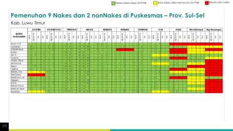 Nakes mencukupi std PMK Ada nakes, blm memenuhi std PMK Belum ada nakes Pemenuhan 9 Nakes dan 2 nonNakes di Puskesmas – Prov. Sul-Sel Kab. Luwu Timur 272
