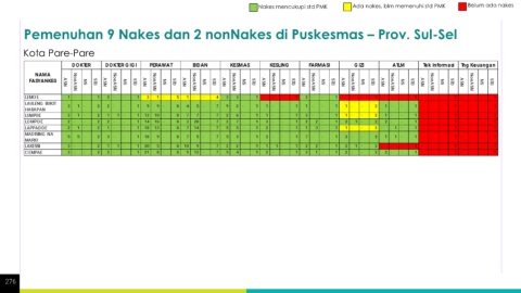 Nakes mencukupi std PMK Ada nakes, blm memenuhi std PMK Belum ada nakes Pemenuhan 9 Nakes dan 2 nonNakes di Puskesmas – Prov. Sul-Sel Kota Pare-Pare 276