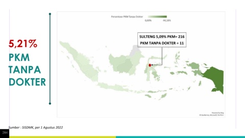 5,21% SULTENG 5,09% PKM= 216 PKM TANPA DOKTER = 11 PKM TANPA DOKTER Sumber : SISDMK, per 1 Agustus 2022 284