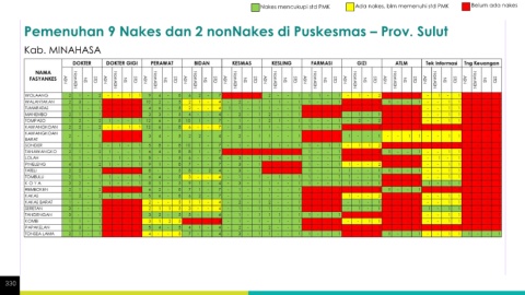Nakes mencukupi std PMK Ada nakes, blm memenuhi std PMK Belum ada nakes Pemenuhan 9 Nakes dan 2 nonNakes di Puskesmas – Prov. Sulut Kab. MINAHASA 330