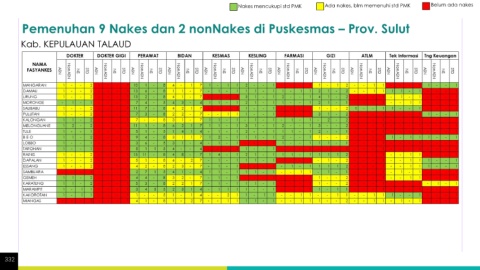 Nakes mencukupi std PMK Ada nakes, blm memenuhi std PMK Belum ada nakes Pemenuhan 9 Nakes dan 2 nonNakes di Puskesmas – Prov. Sulut Kab. KEPULAUAN TALAUD 332