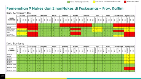 Nakes mencukupi std PMK Ada nakes, blm memenuhi std PMK Belum ada nakes Pemenuhan 9 Nakes dan 2 nonNakes di Puskesmas – Prov. KalTim Kab. Mahakam Ulu Kota Bontang 388