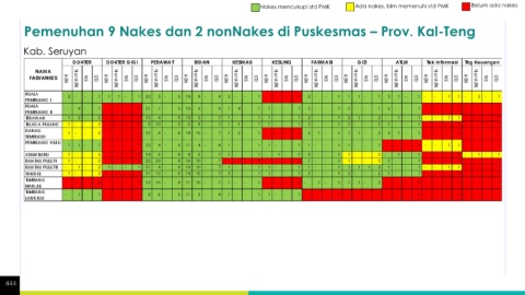 Nakes mencukupi std PMK Ada nakes, blm memenuhi std PMK Belum ada nakes Pemenuhan 9 Nakes dan 2 nonNakes di Puskesmas – Prov. Kal-Teng Kab. Seruyan 444