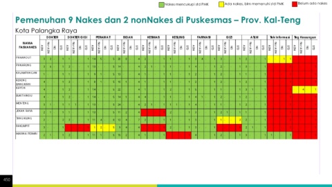 Nakes mencukupi std PMK Ada nakes, blm memenuhi std PMK Belum ada nakes Pemenuhan 9 Nakes dan 2 nonNakes di Puskesmas – Prov. Kal-Teng Kota Palangka Raya 450