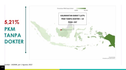 KALIMANTAN BARAT 5,67% 5,21% PKM TANPA DOKTER = 14 PKM= 247 PKM TANPA DOKTER Sumber : SISDMK, per 1 Agustus 2022 456