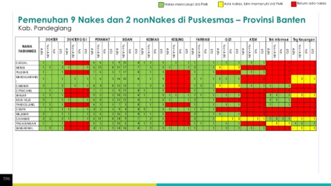 Nakes mencukupi std PMK Ada nakes, blm memenuhi std PMK Belum ada nakes Pemenuhan 9 Nakes dan 2 nonNakes di Puskesmas – Provinsi Banten Kab. Pandeglang 596