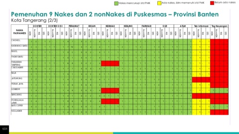 Nakes mencukupi std PMK Ada nakes, blm memenuhi std PMK Belum ada nakes Pemenuhan 9 Nakes dan 2 nonNakes di Puskesmas – Provinsi Banten Kota Tangerang (2/3) 604