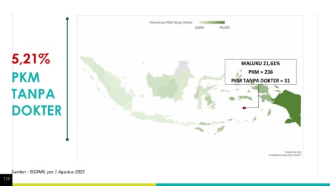 5,21% MALUKU 21,61% PKM PKM TANPA DOKTER = 51 PKM = 236 TANPA DOKTER Sumber : SISDMK, per 1 Agustus 2022 128