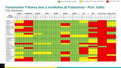 Nakes mencukupi std PMK Ada nakes, blm memenuhi std PMK Belum ada nakes Pemenuhan 9 Nakes dan 2 nonNakes di Puskesmas – Prov. Sultra Kab. Bombana 224