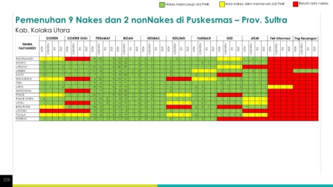 Nakes mencukupi std PMK Ada nakes, blm memenuhi std PMK Belum ada nakes Pemenuhan 9 Nakes dan 2 nonNakes di Puskesmas – Prov. Sultra Kab. Kolaka Utara 226