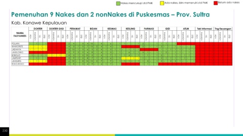 Nakes mencukupi std PMK Ada nakes, blm memenuhi std PMK Belum ada nakes Pemenuhan 9 Nakes dan 2 nonNakes di Puskesmas – Prov. Sultra Kab. Konawe Kepulauan 230