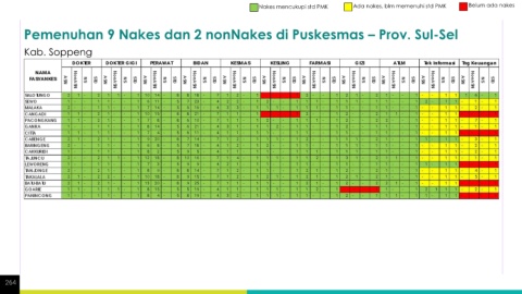 Nakes mencukupi std PMK Ada nakes, blm memenuhi std PMK Belum ada nakes Pemenuhan 9 Nakes dan 2 nonNakes di Puskesmas – Prov. Sul-Sel Kab. Soppeng 264