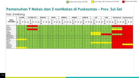 Nakes mencukupi std PMK Ada nakes, blm memenuhi std PMK Belum ada nakes Pemenuhan 9 Nakes dan 2 nonNakes di Puskesmas – Prov. Sul-Sel Kab. Enrekang 268