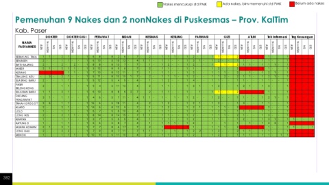 Nakes mencukupi std PMK Ada nakes, blm memenuhi std PMK Belum ada nakes Pemenuhan 9 Nakes dan 2 nonNakes di Puskesmas – Prov. KalTim Kab. Paser 382